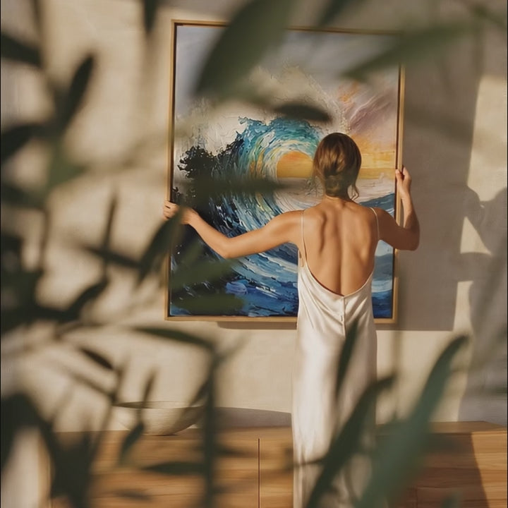 Emotional Presence In the suspended moment before the crash, there is a profound silence. " Tidal Crest" captures the raw, kinetic energy of the ocean not as a fleeting image, but as a permanent, sculpted force. The deep, brooding midnights of the swelling tide collide with the searing warmth of a setting sun, creating a portal of contrast that commands the room. This is not merely a seascape; it is an emotional anchor, inviting the viewer to step out of the digital current and witness the timeless, untamed power of the elements. It grounds the spirit, offering a daily reminder of nature’s relentless, beautiful momentum.
